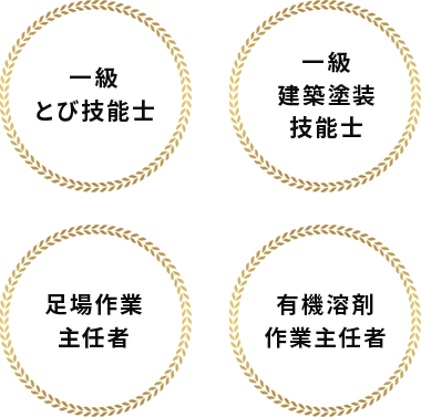 所有資格 | ・茨城県知事許可(般-04)第38082号 ・一級とび技能士 ・一級建築塗装技能士 ・足場作業主任者 ・有機溶剤作業主任者 |